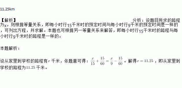 某人从家里骑自行车到学校.若每小时行15千米,可比预定的时间早到15分钟,若每小时行9千米,可比预定的时间晚到15分钟,求从家里到学校的路程有多少千米?