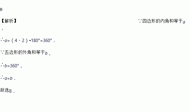 B 【解析】∵四边形的内角和等于a, ∴a=(4﹣2)•180°=360°. ∵五边形的外角和等于b, ∴b=360°, ∴a=b. 故选B.