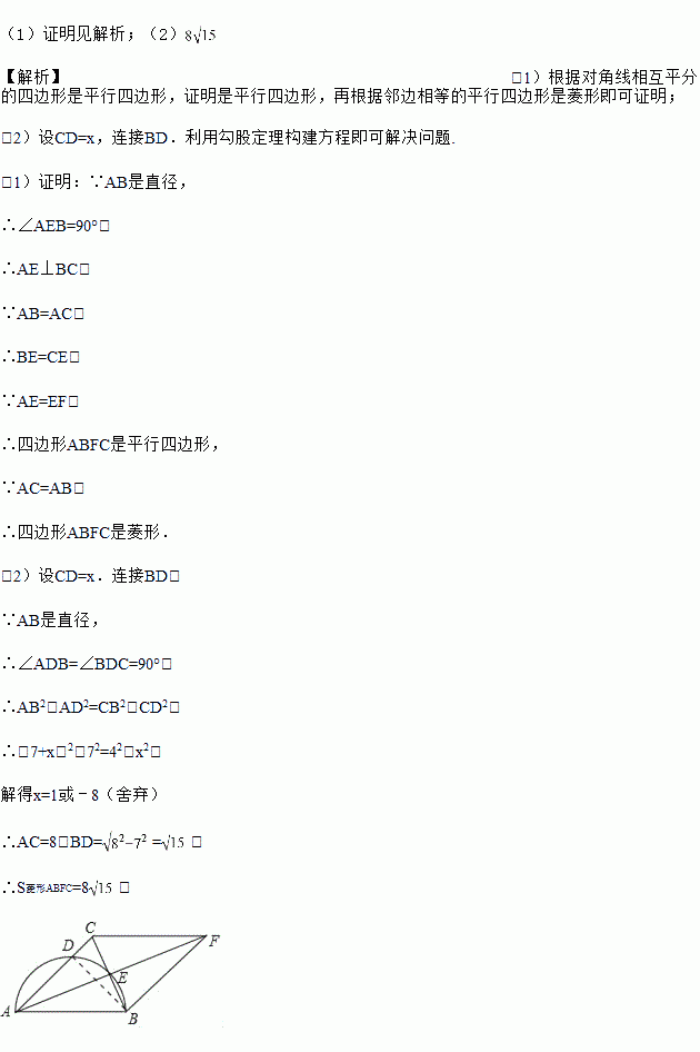 (2)若AD=7,BE=2,求半圆和菱形ABFC的面积.