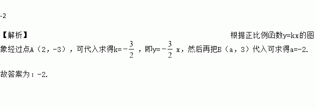 -2 【解析】根据正比例函数y=kx的图象经过点A(2,-3),可代入求得k=,即y=x,然后再把B(a,3)代入可求得a=-2. 故答案为:-2.