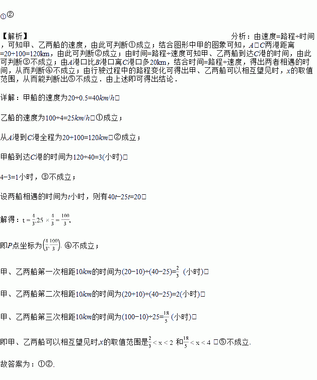①乙船的速度是25km/h;②从A港到C港全程为120km;③甲船比乙船早1.5小时到达终点;④若设图中两者相遇的交点为P点,P点的坐标为(