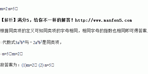 若代数式3a5bm与﹣2anb2是同类项,那么m=_____,n=_____.