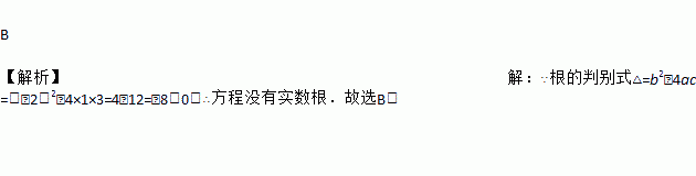 B 【解析】【解析】 ∵根的判别式△=b2﹣4ac=(﹣2)2﹣4×1×3=4﹣12=﹣8<0,∴方程没有实数根.故选B.