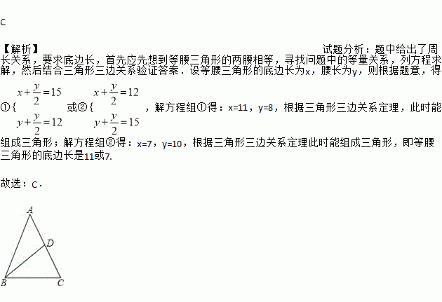 等腰△ABC中,AB=AC,一边上的中线BD将这个三角形的周长分为15和12两个部分,则这个等腰三角形的底边长为( )
