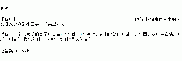 一个不透明的袋子中装有4个红球、2个黑球,它们除颜色外其余都相同,从中任意搞出3球,则事件“摸出的球至少有1个红球”是________事件(填“必然”、 “随机”或“不可能”)