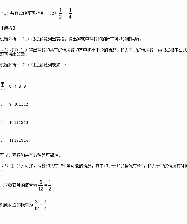 在一次数学兴趣小组活动中,李燕和刘凯两位同学设计了如图所示的两个转盘做游戏(每个转盘被分成面积相等的几个扇形,并在每个扇形区域内标上数字).游戏规则如下:两人分别同时转运甲、乙转盘,转盘停止后,若指针所指区域内两数和小于12,则李燕获胜;若指针所指区域内两数和等于12,则为平局;若指针所指区域内两数和大于12,则刘凯获胜(若指针停在等分线上,重转一次,直到指针指向某一份内为止).