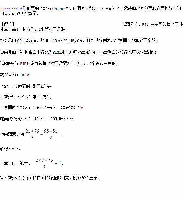 ② 若裁剪出的侧面和底面恰好全部用完,问能做多少个盒子?
