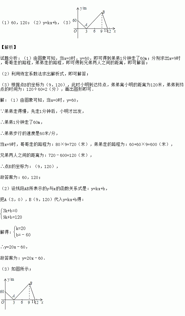 (1)弟弟步行的速度是 m/分,点B的坐标是 ;