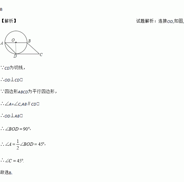 如图,若以平行四边形一边AB为直径的圆恰好与边CD相切于点D,则∠C的度数是( )