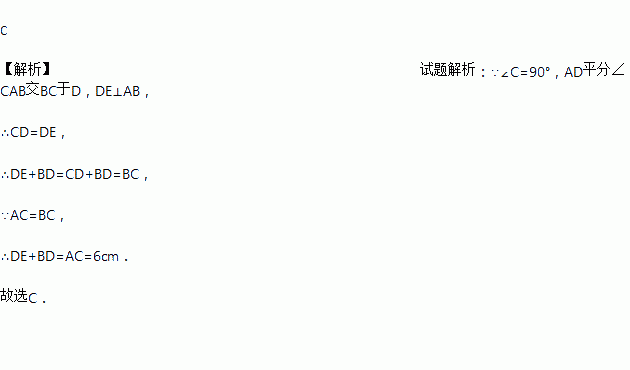 如图,△ABC中,AC=BC,∠C=90°,AD平分∠CAB交BC于D,DE⊥AB于点E,且AC=6cm,则DE+BD等于( )