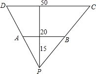 如图所示,一条河的两岸有一段是平行的,在河的南岸边每隔5米有一棵树,在北岸边每隔50米有一根电线杆.小丽站在离南岸边15米的点P处看北岸,发现北岸相邻的两根电线杆恰好被南岸的两棵树遮住,并且在这两棵树之间还有三棵树,则河宽为________米.