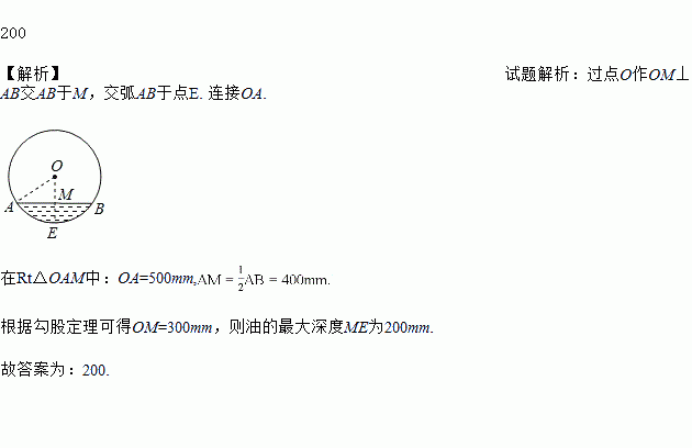 在直径为1000 mm的圆柱形油槽内装入一些油后,截面如图所示.若油面宽AB=800 mm,则油的最大深度为_______mm.