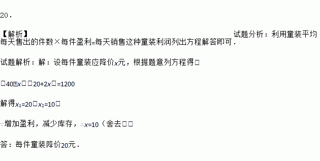 某商店在销售中发现:“米奇”牌童装平均每天可售出20件,每件赢利40元.为了迎“六一”儿童节,商场决定适当地降价,以扩大销售量,增加盈利,减少库存.经市场调查发现,如果每件童装每降价4元,那么平均每天就可多售出8件,要想平均每天在销售这种童装上盈利1200元,那么每件童装应降价多少元?