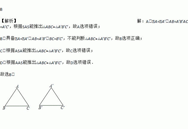 B 【解析】【解析】 A.∠A=∠A′,AB=A′B′AC=A′C′,根据SAS能推出△ABC≌△A′B′C′,故A选项错误; B.具备∠A=∠A′,AB=A′B′,BC=B′C′,不能判断△ABC≌△A′B′C′,故B选项正确; C.根据ASA能推出△ABC≌△A′B′C′,故C选项错误; D.根据AAS能推出△ABC≌△A′B′C′,故D选项错误. 故选B. ...