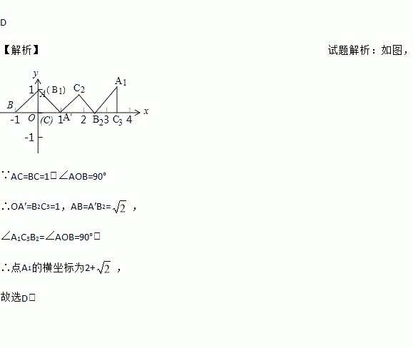 如图,等腰直角三角形ABC的直角顶点C与平面直角坐标系的坐标原点O重合,AC,BC分别在坐标轴上,AC=BC=1,△ABC在x轴正半轴上沿顺时针方向作无滑动的滚动,在滚动过程中,当点C第一次落在x轴正半轴上时,点A的对应点A1的横坐标是( )
