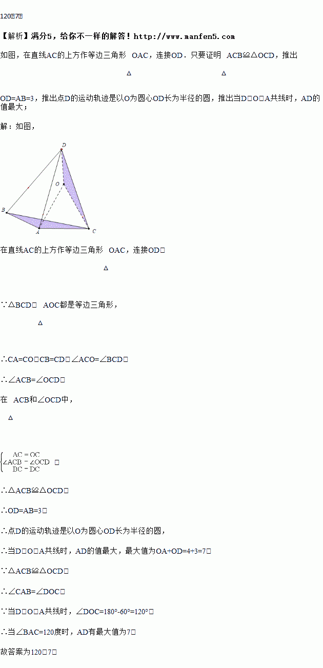 如图三角形ABC中,AB=3,AC=4,以BC为边向三角形外作等边三角形BCD,连AD,则当∠BAC=_____度时,AD有最大值_____.