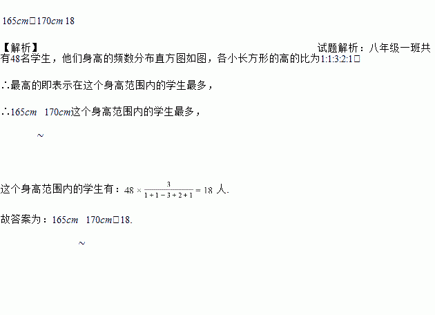 七年级一班共有48名学生,他们身高的频数分布直方图如图,各小长方形的高的比为1∶1∶3∶2∶1,则身高范围在__________________的学生最多,是____人.