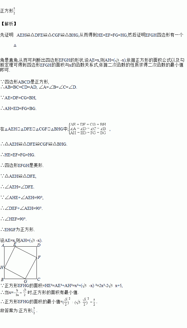 如图,已知正方形的边长为,点,,,分别在正方形的四条边上,且,则四边形的形状为________,它的面积的最小值为________.