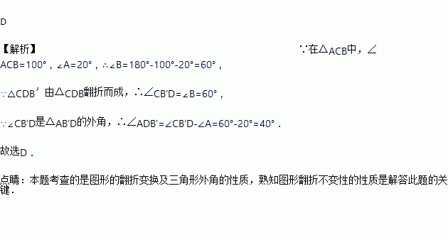 如图,在△ACB中,∠ACB=100°,∠A=20°,D是AB上一点.将△ABC沿CD折叠,使B点落在AC边上的B′处,则∠ADB′等于( )