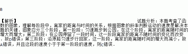 某人匀速跑步到公园,在公园里某处停留了一段时间,再沿原路匀速步行回家,此人离家的距离y与时间x的关系的大致图象是( )
