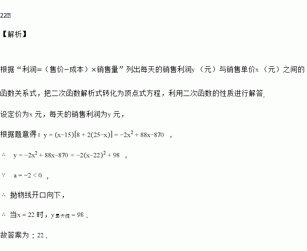 某服装店购进单价为15元童装若干件,销售一段时间后发现:当销售价为25元时平均每天能售出8件,而当销售价每降低2元,平均每天能多售出4件,当每件的定价为___元时,该服装店平均每天的销售利润最大.