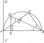(2)连AD,根据圆周角定理推论得到∠ABC=90°,由DE⊥AB得到∠DEB=90°,则∠1+∠5=90°,∠3+∠4=90°,又D是弧AC的中点,即弧CD=弧DA,得到∠3=∠5,于是∠1=∠4,利用对顶角相等易得∠1=∠2,则有FD=FG.