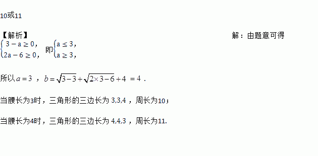 已知a,b为等腰三角形的两条边长,且a,b满足b=+4,求此三角形的周长