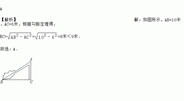 A 【解析】【解析】 如图所示,AB=10米,AC=6米,根据勾股定理得, BC===8米<9米. 故选:A.