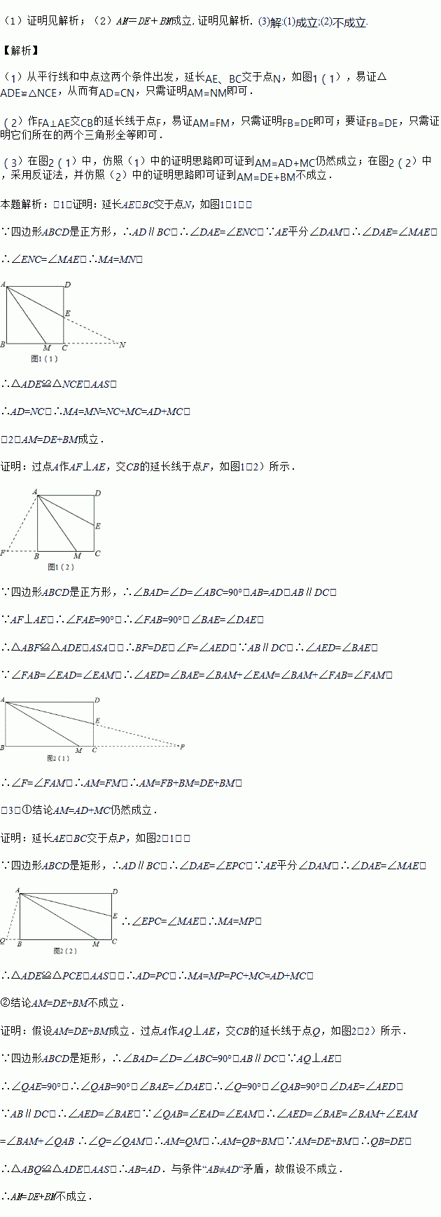 如图1,四边形ABCD是正方形,M是BC边上的一点,E是CD边的中点,AE平分∠DAM.