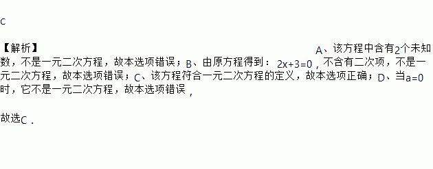 C 【解析】A、该方程中含有2个未知数,不是一元二次方程,故本选项错误;B、由原方程得到: 2x+3=0,不含有二次项,不是一元二次方程,故本选项错误;C、该方程符合一元二次方程的定义,故本选项正确;D、当a=0时,它不是一元二次方程,故本选项错误, 故选C.