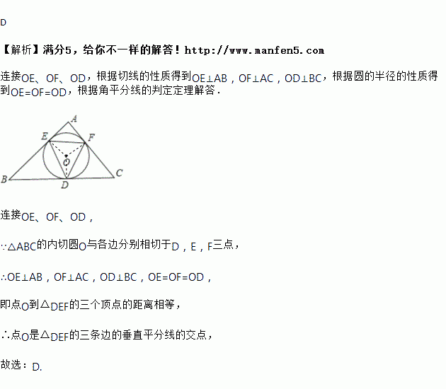 如图,已知△ABC的内切圆⊙O与各边相切于点D、E、F,则点O是△DEF的 ( )
