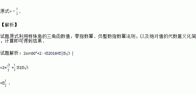 计算:2sin60°+2﹣1﹣20160﹣|﹣