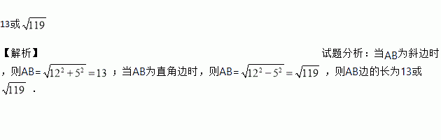 13或 【解析】试题分析:当AB为斜边时,则AB=;当AB为直角边时,则AB=,则AB边的长为13或.