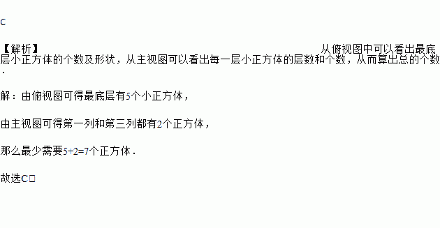 C 【解析】从俯视图中可以看出最底层小正方体的个数及形状,从主视图可以看出每一层小正方体的层数和个数,从而算出总的个数. 【解析】 由俯视图可得最底层有5个小正方体, 由主视图可得第一列和第三列都有2个正方体, 那么最少需要5+2=7个正方体. 故选C.