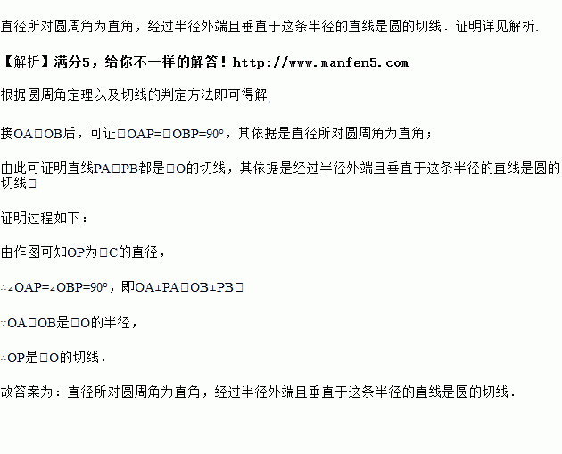 Çë»Ø´ð£ºÁ¬½ÓOA£¬OBºó£¬¿ÉÖ¤¡ÏOAP=¡ÏOBP=90¡ã£¬ÆäÒÀ¾ÝÊÇ¡¡ ¡¡£»ÓÉ´Ë¿ÉÖ¤Ã÷Ö±ÏßPA£¬PB¶¼ÊÇ¡ÑOµÄÇÐÏߣ¬ÆäÒÀ¾ÝÊÇ¡¡ ¡¡£®Çëд³öÖ¤Ã÷¹ý³Ì£®