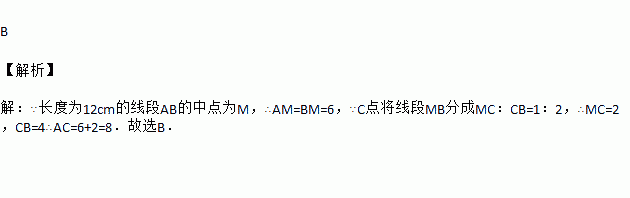 如图,长度为12cm的线段AB的中点为M,C点将线段MB分成MC︰CB=1︰2,则线段AC的长度为( )