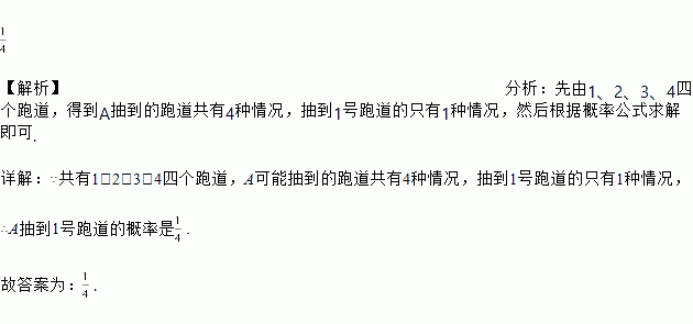 A、B、C、D四名选手参加50米决赛,赛场共设1,2,3,4四条跑道,选手以随机抽签的方式决定各自的跑道。若A先抽签,则A抽到1号跑道的概率是________;