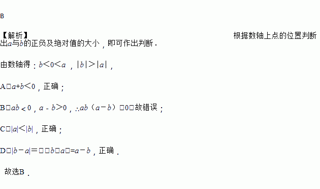 A. a+b<0 B. ab(a-b)>0 C. |a|<|b| D. |b-a|=a-b
