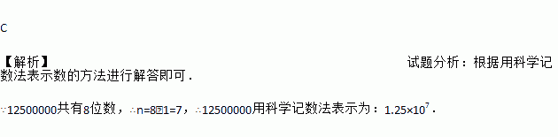 C 【解析】试题分析:根据用科学记数法表示数的方法进行解答即可. ∵12500000共有8位数,∴n=8﹣1=7,∴12500000用科学记数法表示为:1.25×107.