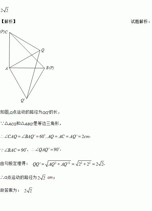 在△ABC中,∠BAC=90°,AB=AC=2 cm,线段BC上一动点P从C点开始运动,到B点停止.以AP为边在AC的右侧作等边△APQ,则点Q运动的路径为___________cm