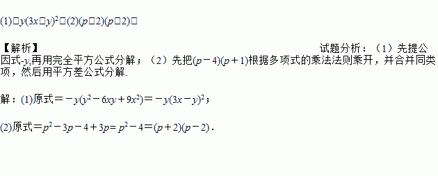 (1)-y(3x-y)2;(2)(p+2)(p-2). 【解析】试题分析:(1)先提公因式-y,再用完全平方公式分解;(2)先把(p-4)(p+1)根据多项式的乘法法则乘开,并合并同类项,然后用平方差公式分解. 【解析】 (1)原式=-y(y2-6xy+9x2)=-y(3x-y)2; (2)原式=p2-3p-4+3p= p2-4=(p+2)(p-2).