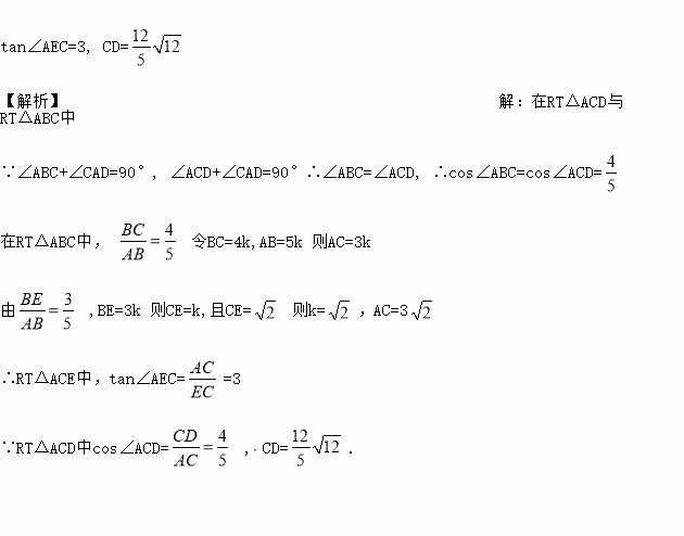 已知在△ABC中,∠ACB=90°,CD⊥AB于D,BE:AB=3:5,若CE=, ,求tan∠AEC值及CD的长.