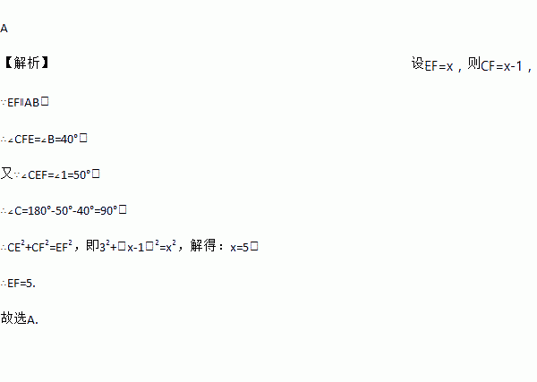 如图,在△ABC中,∠B=40°,EF∥AB,∠1=50°,CE=3,EF比CF大1,则EF的长为( )