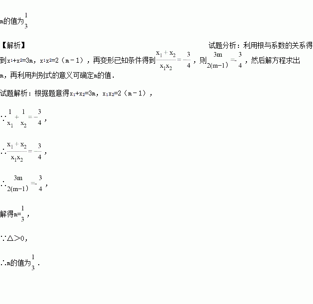 已知关于x的方程x2﹣3mx+2(m﹣1)=0的两根为x1、x2,且+=﹣,则m的值是多少?