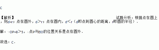 C 【解析】试题分析:根据点在圆上,则d=r;点在圆外,d>r;点在圆内,d<r(d即点到圆心的距离,r即圆的半径). 【解析】 ∵OP=8>5,∴点P与⊙O的位置关系是点在圆外. 故选:C.