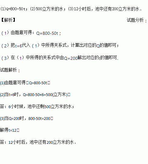 已知水池中有800立方米的水,每小时抽50立方米.