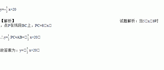 如图,长方形ABCD中,AB=5,AD=3,点P从点A出发,沿长方形ABCD的边逆时针运动,设点P运动的距离为x;△APC的面积为y,如果5<x<8,那么y关于x的函数关系式为__________.