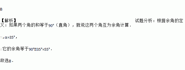 B 【解析】试题分析:根据余角的定义:如果两个角的和等于90°(直角),就说这两个角互为余角计算. ∵∠α=35°, ∴它的余角等于90°﹣35°=55°. 故选B.