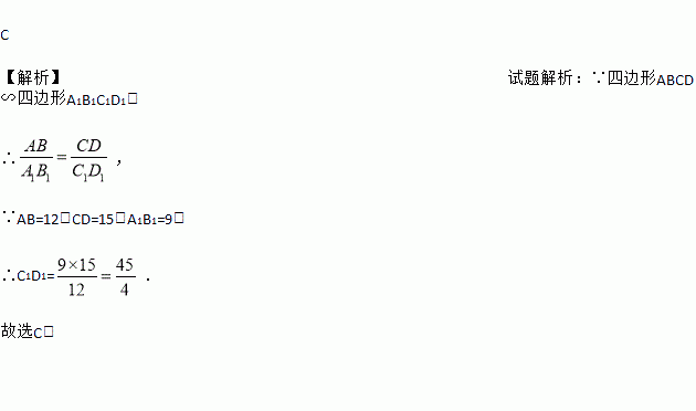 如图,四边形ABCD∽四边形A1B1C1D1,AB=12,CD=15,A1B1=9,则边C1D1的长是( )