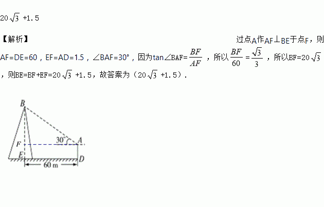 小强和小明去测量一座古塔的高度,如图,他们在离古塔60 m处( A )用测角仪测得塔顶的仰角为30°,已知测角仪高 AD =1.5 m,则古塔BE的高为______m.